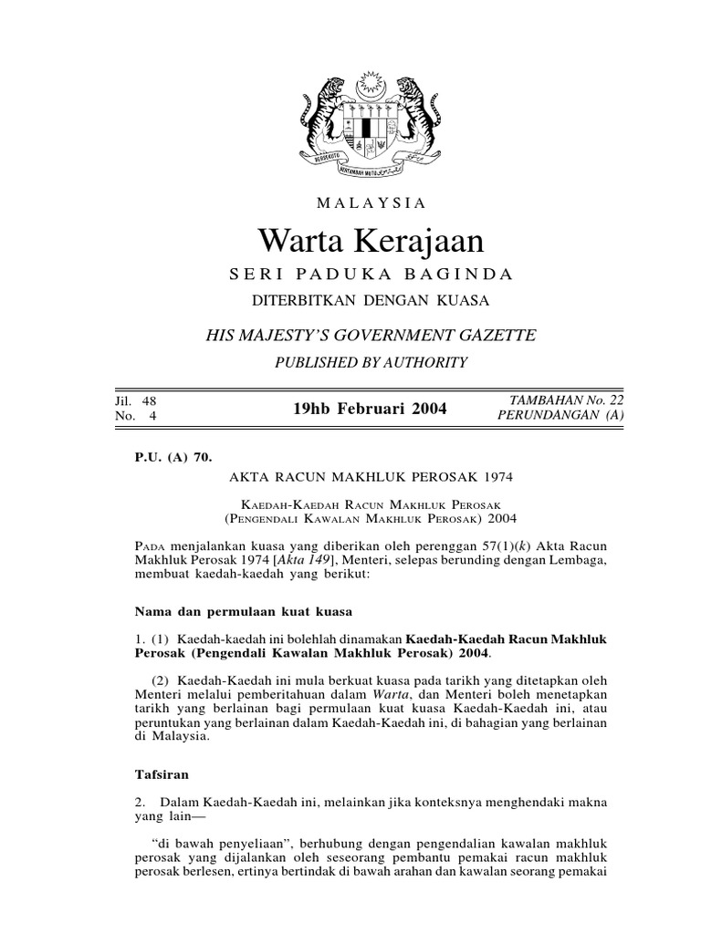Akta racun makhluk perosak 1974 pesticides act 1974 kaedah-kaedah racun makhluk perosak pengendali kawalan makhluk perosak 2004 pesticides pest control operator rules 2004. Jabatan Pertanian Malaysia website. Adalah menjadi satu kesalahan jika.